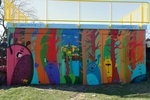 2008Moeder met kind aan de wandel in een overdadige omgeving. Muurschildering in speeltuin de Zandweerd te Deventer, augustus 2008.